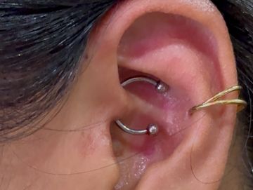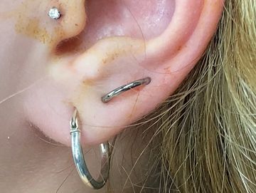Daith piercing includes internally threaded titanium circular barbell (horseshoe).