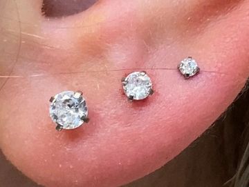 Lobe piercing include threadless surgical steel labret studs. Gem upgrade +$10.