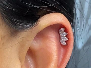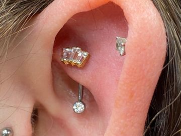 Snug/Rook piercings include internally threaded titanium curved barbells with bezel set clear gems on both ends.
