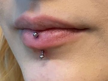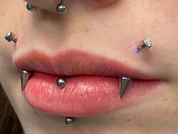 Bite Piercings include either threadless labret studs or internally threaded curved barbells, and refer to paired lip piercing variants.