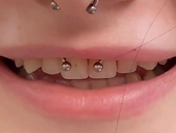 Smiley piercing includes 16 ga internally threaded circular barbell (horseshoe). Will potentially damage your teeth and/or gums. I suggest take photos every few days to track damage.