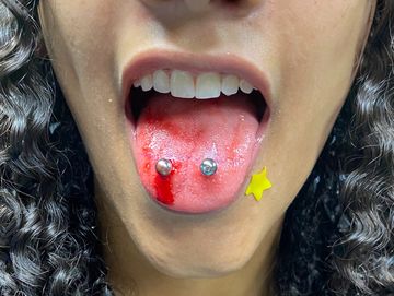 Tongue piercing includes extra-long barbell to facilitate the swelling phase of the healing process. 14ga