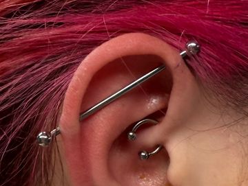 Industrial piercing includes internally threaded surgical steel barbell. Titanium threadless jewelry +$40.